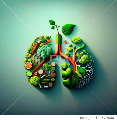 Health Day, the concept of human lungs in the form of grass and trees. AI generated. Green background.