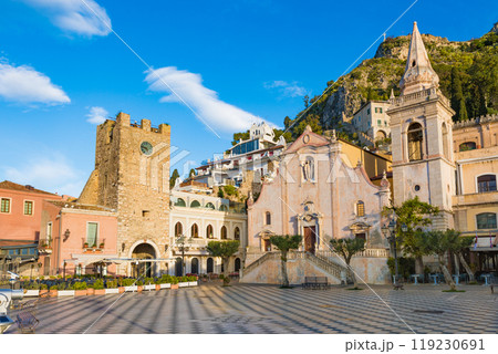 Square Piazza IX Aprile with San Giuseppe church and Clock Tower in Taormina, Sicily, Italy.