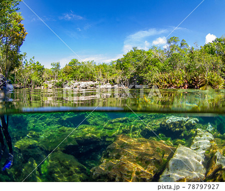 泉(セノーテ)の水中から水面を見上げる (プラヤ・デル・カルメン、メキシコ)