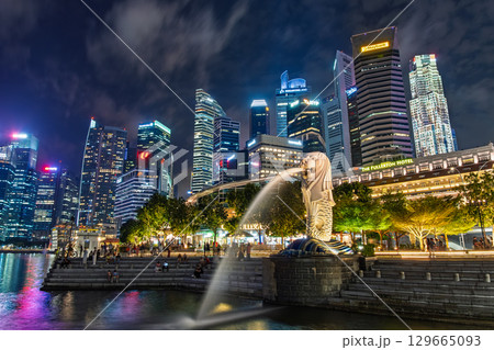 シンガポール 夜のマーライオン公園と高層ビル群