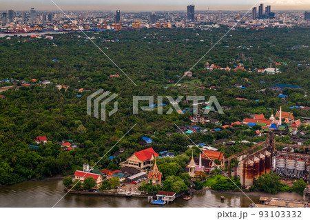 View of the Chao Phraya River and the main business areas and green areas of Bang Krachao Subdistrict.