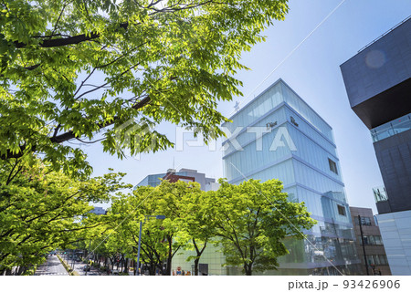 新緑の表参道の風景・陽光で輝くケヤキ並木とブランドショップ