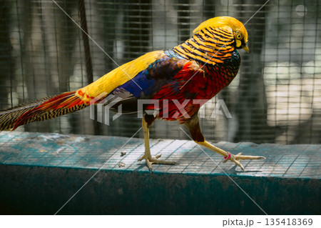 Golden Pheasant Bird Perched on a Wooden Branch in a Cage
