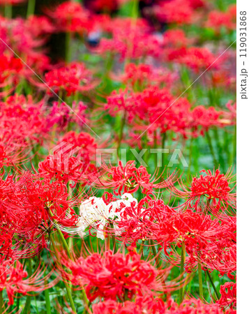 秋の風物詩 華やかに咲いた真っ赤な彼岸花に囲まれた一輪の白い彼岸花