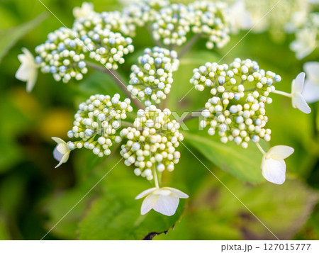 咲きかけの白いガクアジサイ