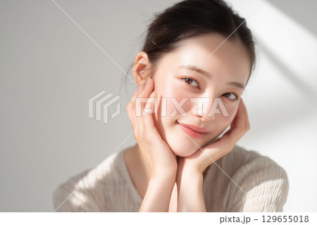 白い壁の前で頬に手を添える素肌の美しい日本人女性