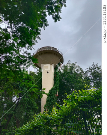 Tall cylindrical water tower surrounded by lush greenery, climbing vines on shaft, off-white structure with top balcony, old utility landmark blended with nature in urban park, cloudy sky background,