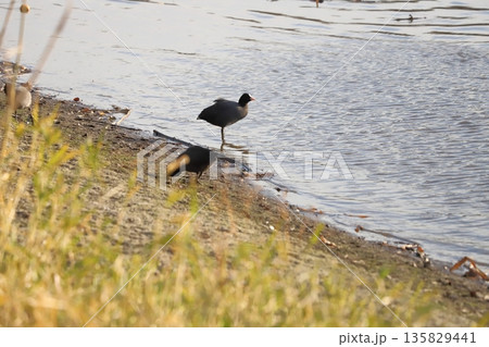 冬の川岸で餌を探す黒い羽のオオバン(大鷭)