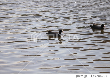 冬の川で泳ぐ2羽の黒いオオバン(大鷭)