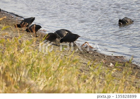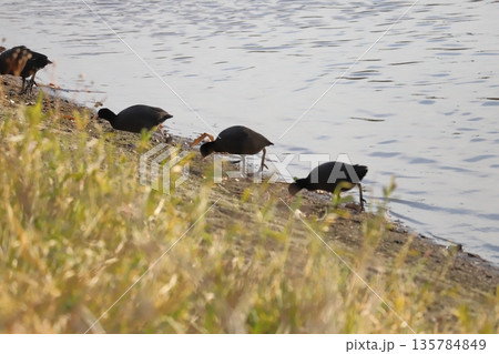 日本の埼玉県蓮田市を流れる元荒川の河川敷で餌を探すオオバンの群れ