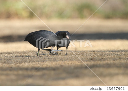 生き物 鳥類 オオバン、池に続く芝生の広場で採餌中。歩くには不便そうな大きな足が目立ちます