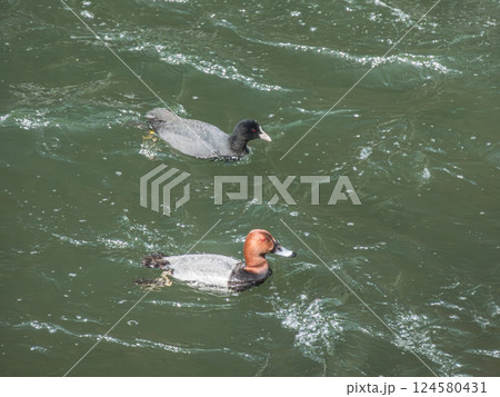 川を泳ぐホシハジロ(オス)とオオバン 宇治市宇治川