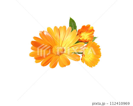 Marigold or calendula flower, buds and leaves bunch isolated on white