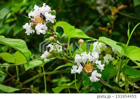 A vibrant of blooming white crape myrtle with leaves and bud .