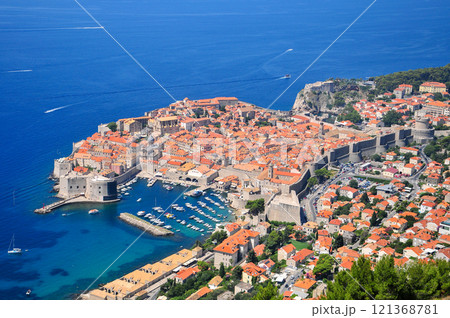 クロアチアの世界文化遺産、アドリア海の真珠ドブロブニク ロヴリイェナツ要塞付近より、旧市街を囲む城壁
