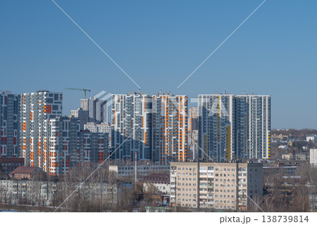 Colorful cityscape with new buildings. Vivid urban outline with bright facades and cranes. Dynamic city skyline featuring colorful structures and reflective glass surfaces