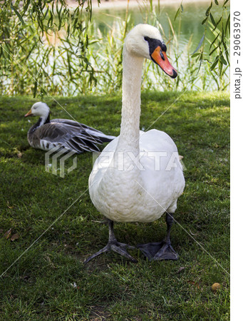 晴天の牛久沼水辺公園のコブハクチョウ 茨城