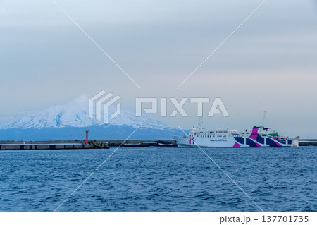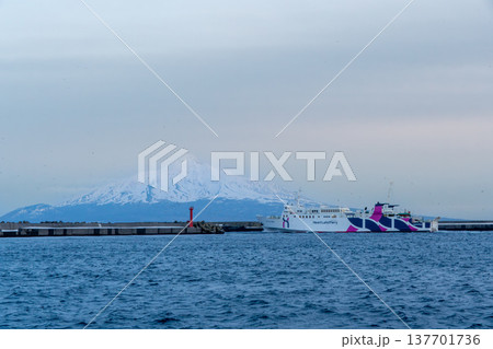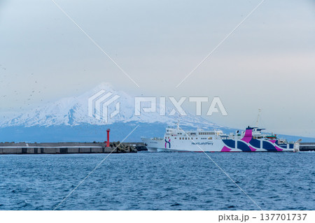 礼文島、香深港を出航するハートランドフェリーと利尻富士の絶景