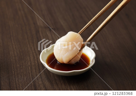 帆立の刺身を醤油につける