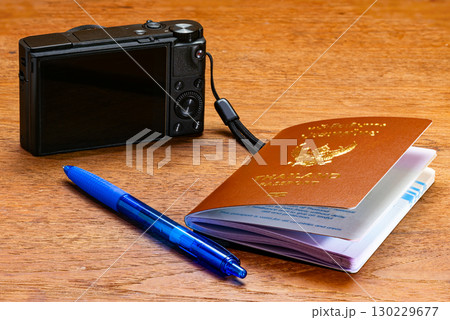 View of Thai passport, blue ballpoint pen and digital compact camera.
