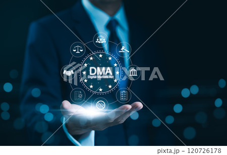 DMA, Digital Markets Act Concept. Businessman presents virtual "Digital Markets Act" with regulations icons, governance, and digital compliance. importance of legal frameworks in digital market. EU,