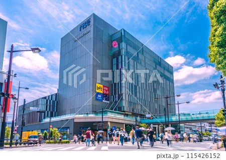日本の東京都市景観 9月。二子玉川駅や電車、バスなどを望む