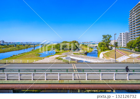 日本の東京都市景観10月17日…二子玉川駅近くの整備された多摩川河川敷などを望む
