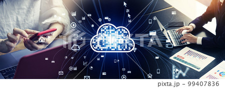 会議するビジネスパーソンのグループとクラウドコンピューティングのコンセプト