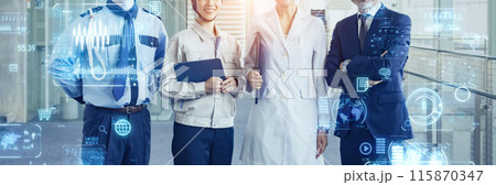 ビジネスパーソンのグループとデジタルテクノロジー バナー・広告向け横長ビジュアル