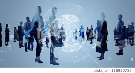 街を歩く多国籍ビジネスパーソンのグループとデジタルテクノロジーのコンセプト