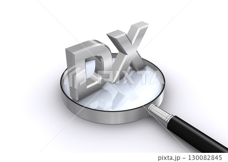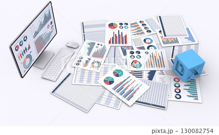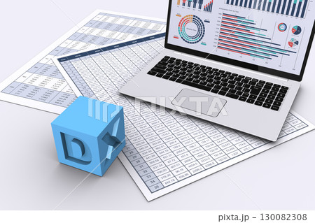 DXのキューブと複数のビジネス書類とデスクトップパソコン