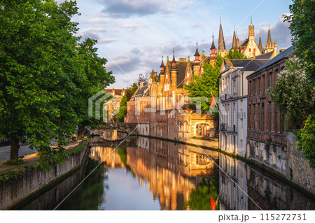 Bruges, Belgium. Rozenhoedkaai Canal in downtown of Brugge, sunrise colors. Famous Flanders destination.