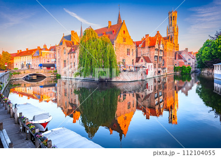 Bruges, Belgium. Rozenhoedkaai in sunrise light, old town with Belfry water reflection