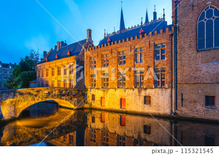 Bruges, Belgium. Twilight Rozenhoedkaai in golden hues water canal reflection