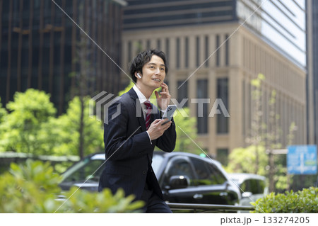 イヤホンをつけスマートフォンを持った30代のビジネスマン