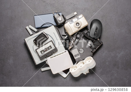Old electronic devices on a dark background. The concept of recycling and disposal of electronic waste. Copy space