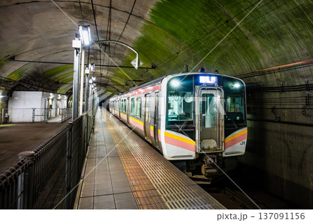 冬の夜の水上駅に停車中の上越線E129系電車(水上⇔長岡)