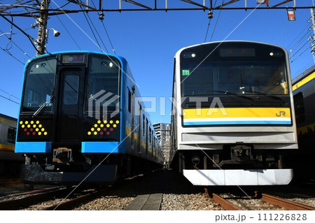 車両基地で並ぶ鶴見線のE131系1000番台(大川表示)と南武支線のE127系(団体表示)