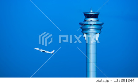 羽田空港の管制塔と離陸するJAL機