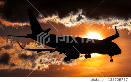 夕焼け空を飛ぶ飛行機