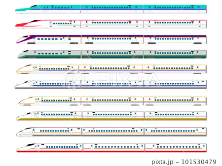 東海道新幹線のぞみと西九州新幹線かもめと東北新幹線はやぶさと秋田新幹線こまちの車両線画セット