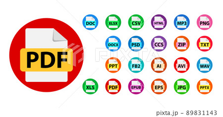Vector icon set. File formats for working with text and read. Line color collection: html, doc, docx, csv, odt, pptx, rtf, txt, xls, xlsx, pdf, epub, fb2, mobi, djvu