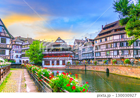 Strasbourg city historic centre, The Petite France Quarter Quartier des Tanneurs with buildings medieval colorful houses on bank River Ill canal in old town Centre, Alsace Grand Est region, France