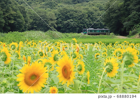 烏山線「ひまわり畑と山間部の木々に囲まれて」