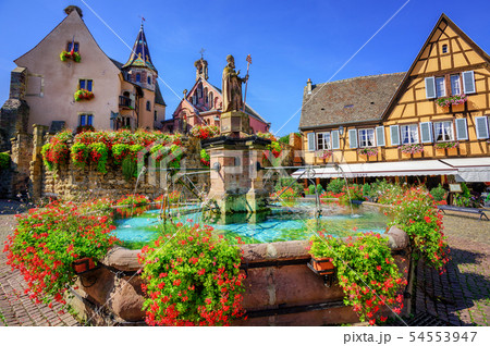 Eguisheim, France. Place du Chateau Saint Leon in picturesque village with colorful half-timbered houses and flower-filled balconies, France.
