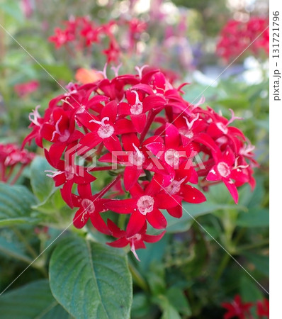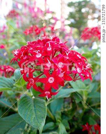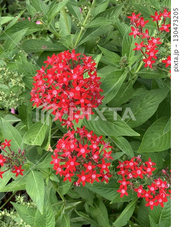 公園の花壇に赤色のペンタスの花が咲いています。学名はPentas lanceolataです。