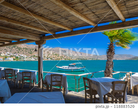 ギリシャの海辺のレストランからの眺め (クレタ島、エロウンダ)