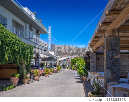 ギリシャのリゾートの午後の静かな時間帯のレストラン街 (クレタ島、エロウンダ)