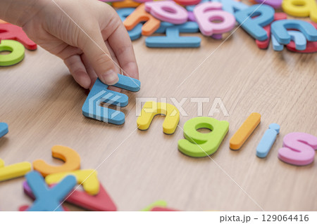 カラフルなEnglishのアフファベットを並べる手