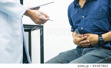The young man has a stomachache. See a doctor for treatment. The doctor is diagnosing the pain in the young man's stomach.